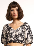 This Cade Top is made with a unique woodblock design and features a beautiful floral pattern. The bubble cropped style adds a touch of playfulness to any outfit. Made with quality materials, this top is perfect for any occasion.
