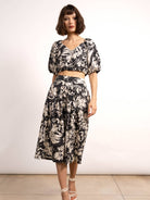The Sara Midi Dress boasts a stunning woodblock floral design, perfect for any occasion. This dress offers both elegance and comfort with its culotte style. Elevate your wardrobe with this exquisite piece.
